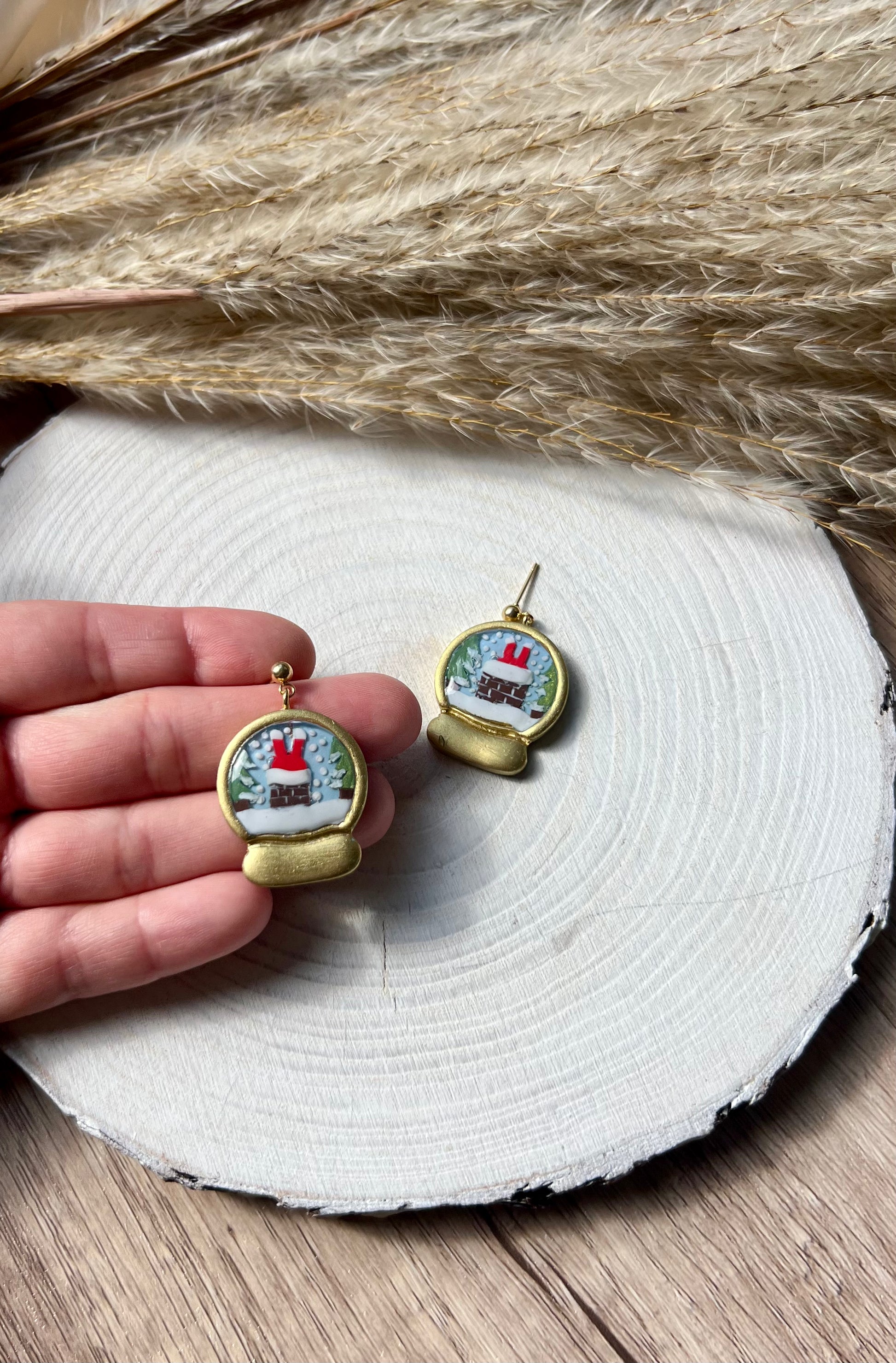 Christmas snow globe earrings made out of polymer clay and finished off with resin.