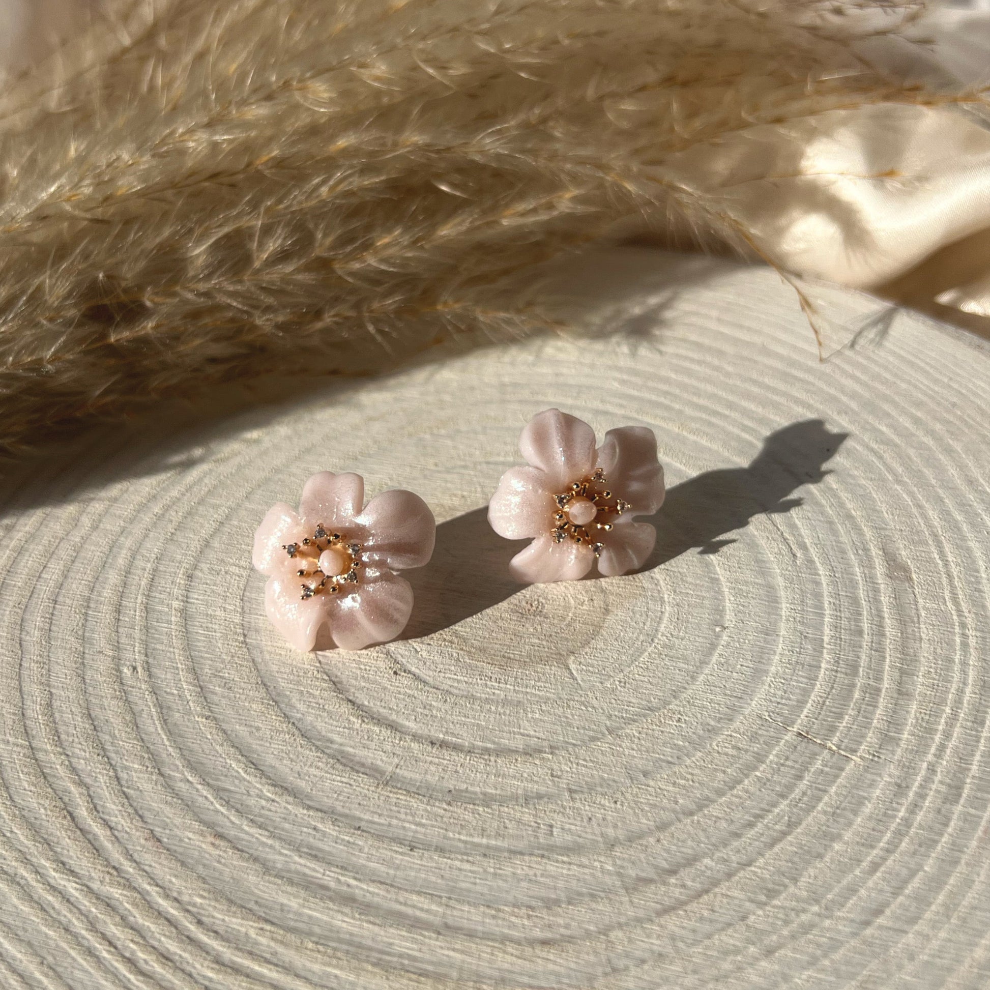 Brighten up any outfit with this light pink pearly flower! Made from high-quality white polymer clay, it features a surgical steel post for added security. At 3cm in size, it's both stylish and durable - perfect for any occasion.