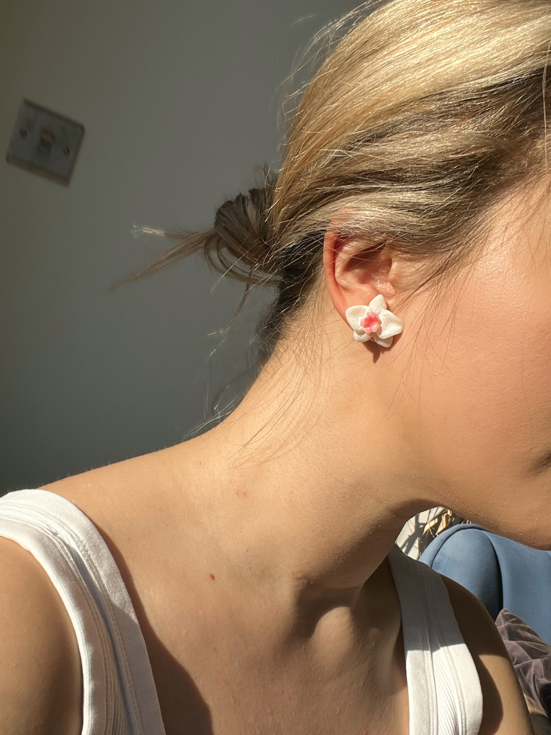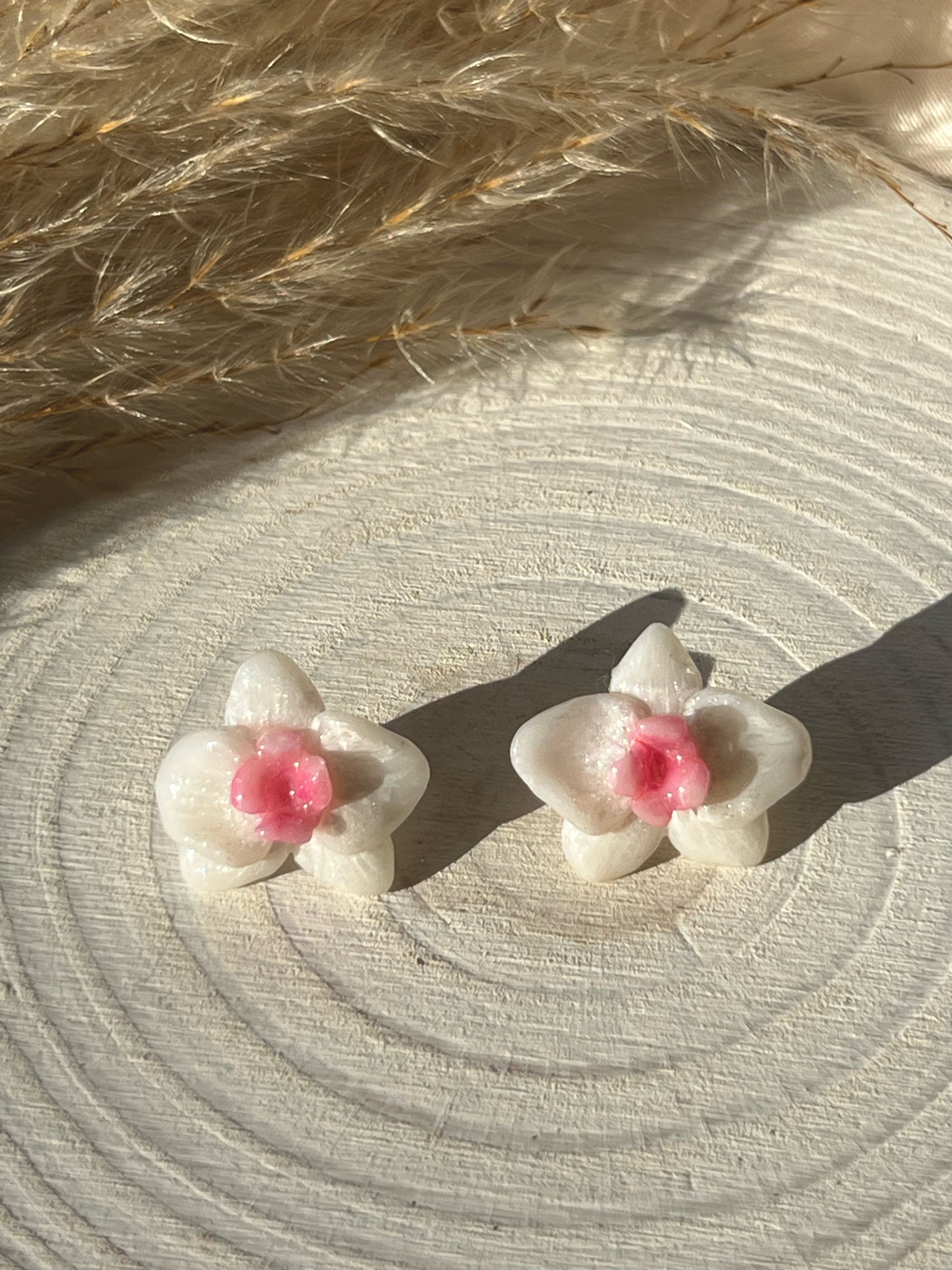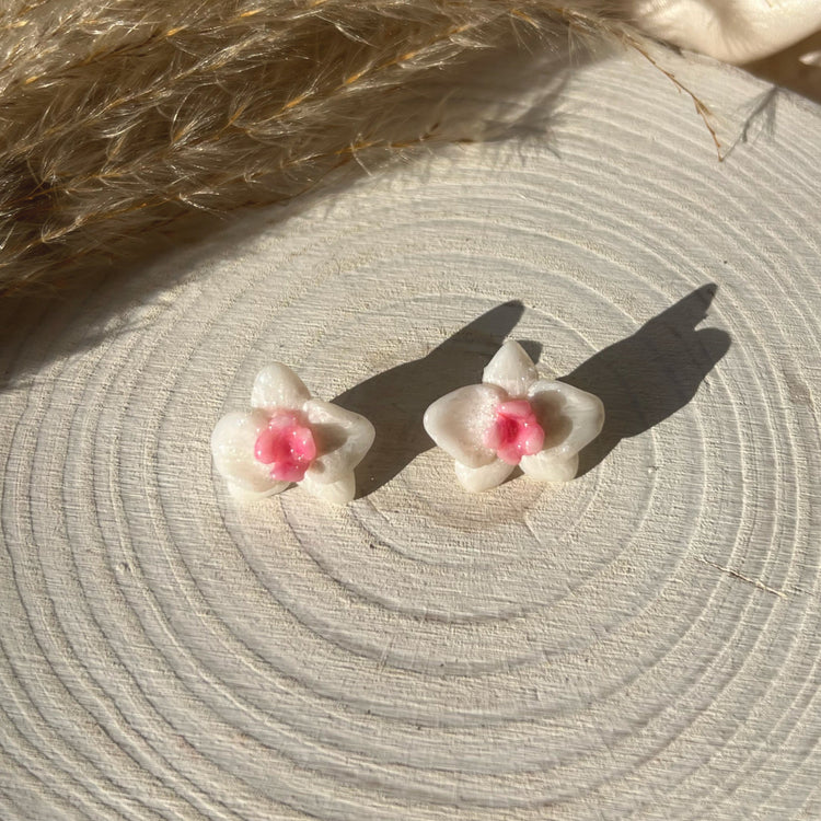 Brighten up any outfit with this white pearl orchid earrings ! Made from high-quality white polymer clay, it features a surgical steel post embedded with resin for added security At 3cm in size, it's both stylish and durable - perfect for any occasion.
