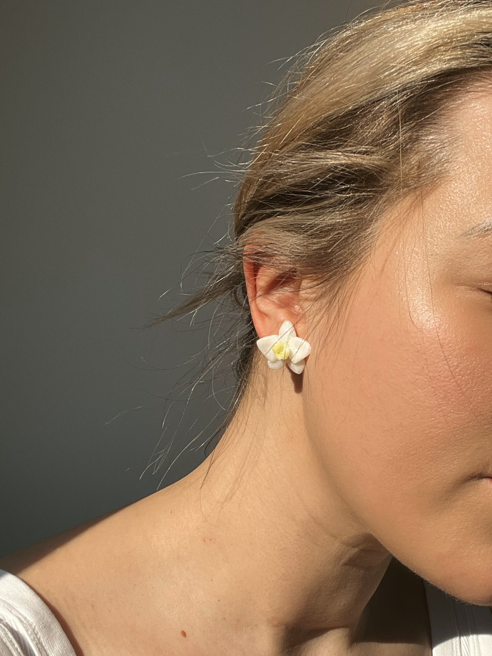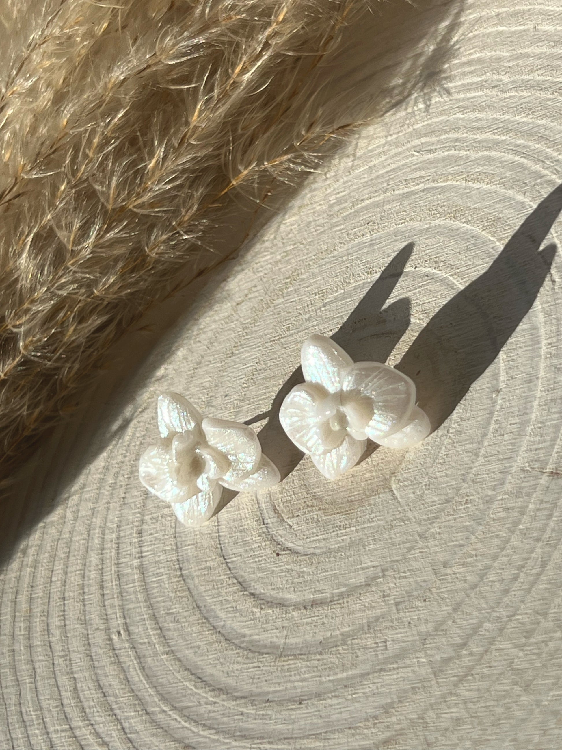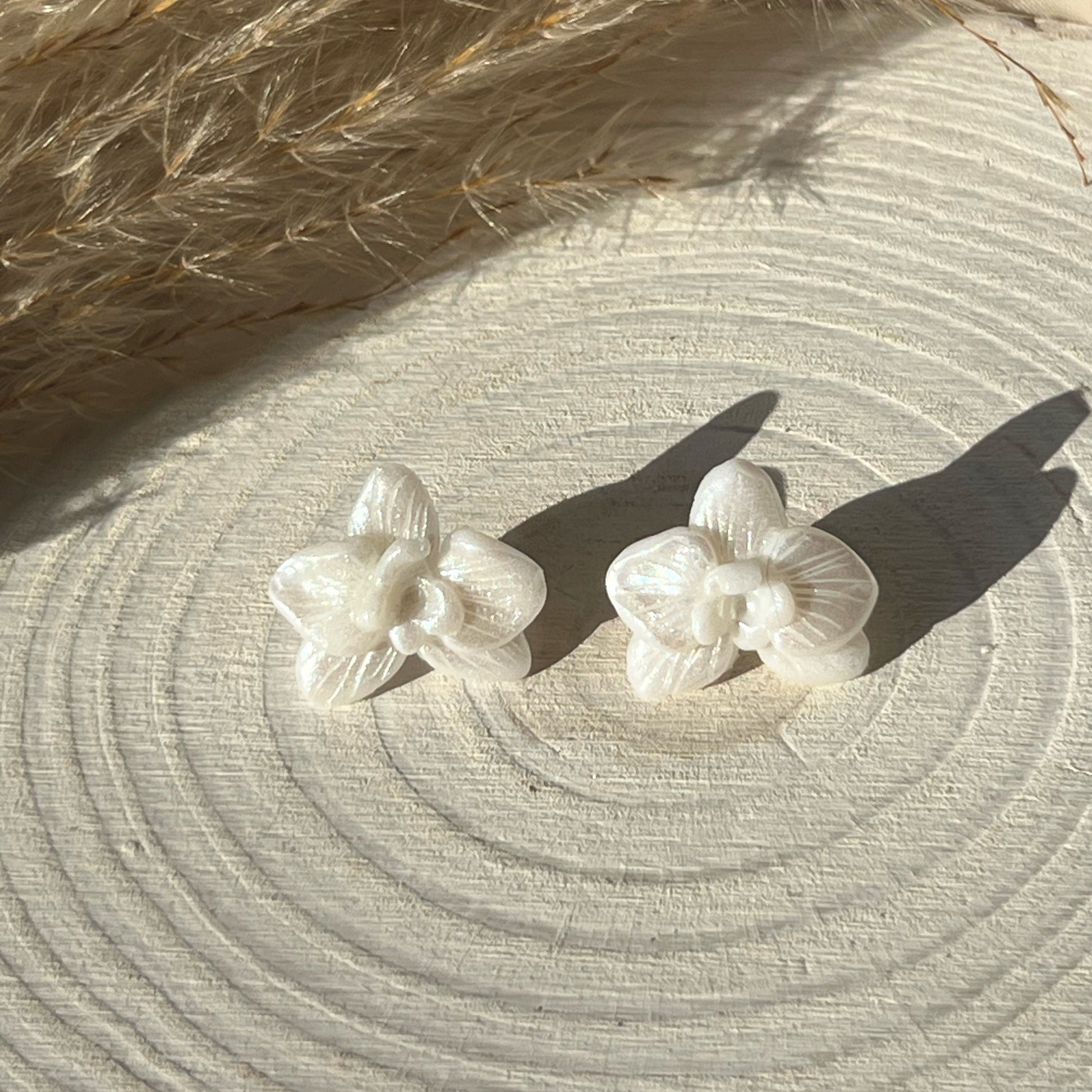 Brighten up any outfit with this white pearl orchid earrings ! Made from high-quality white polymer clay, it features a surgical steel post embedded with resin for added security At 3cm in size, it's both stylish and durable - perfect for any occasion.