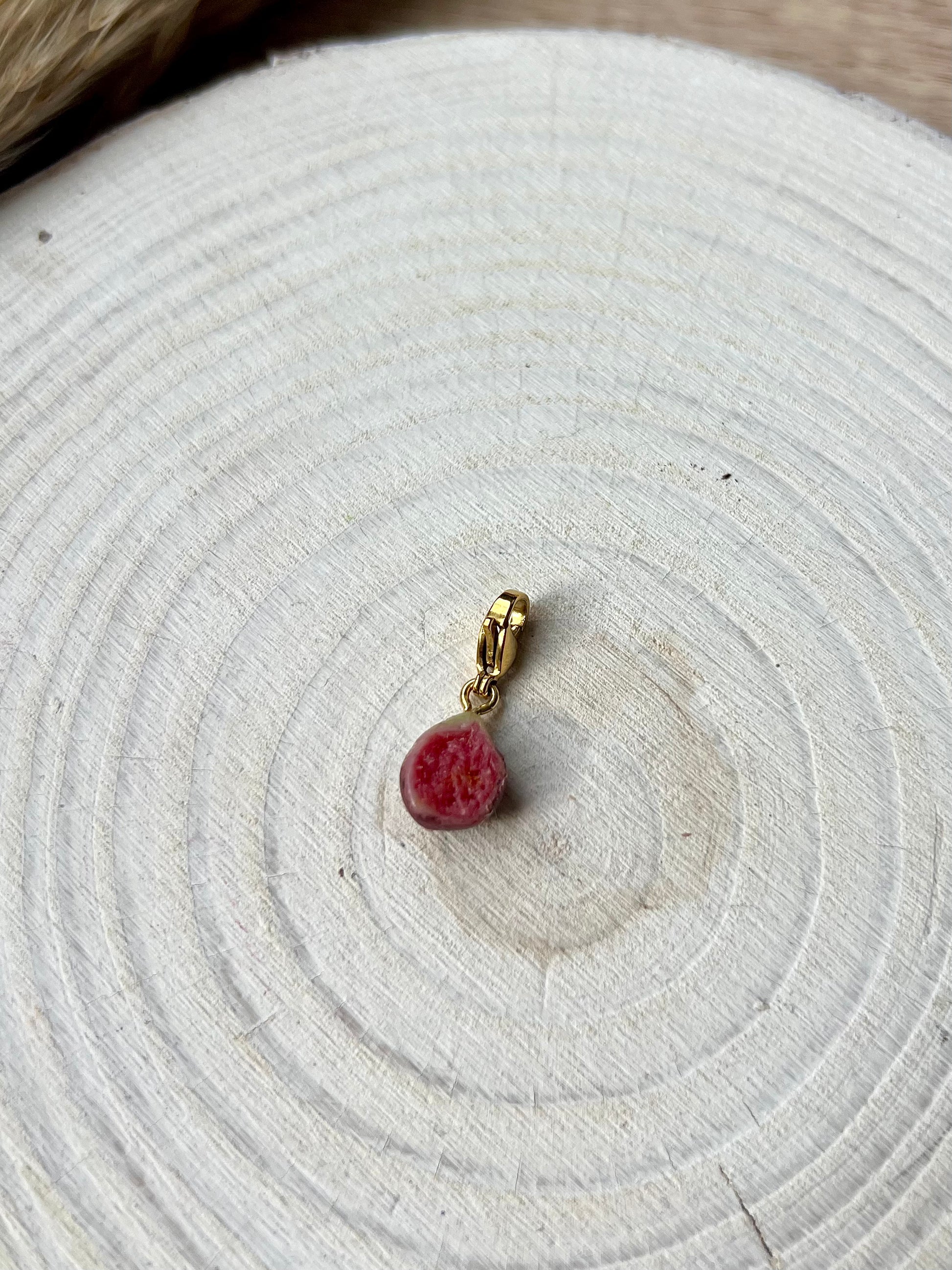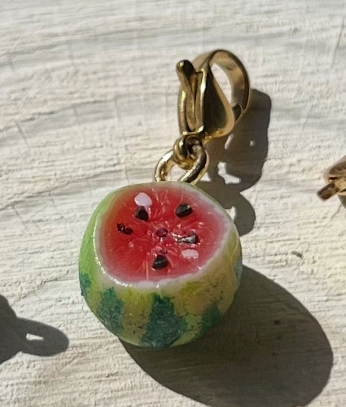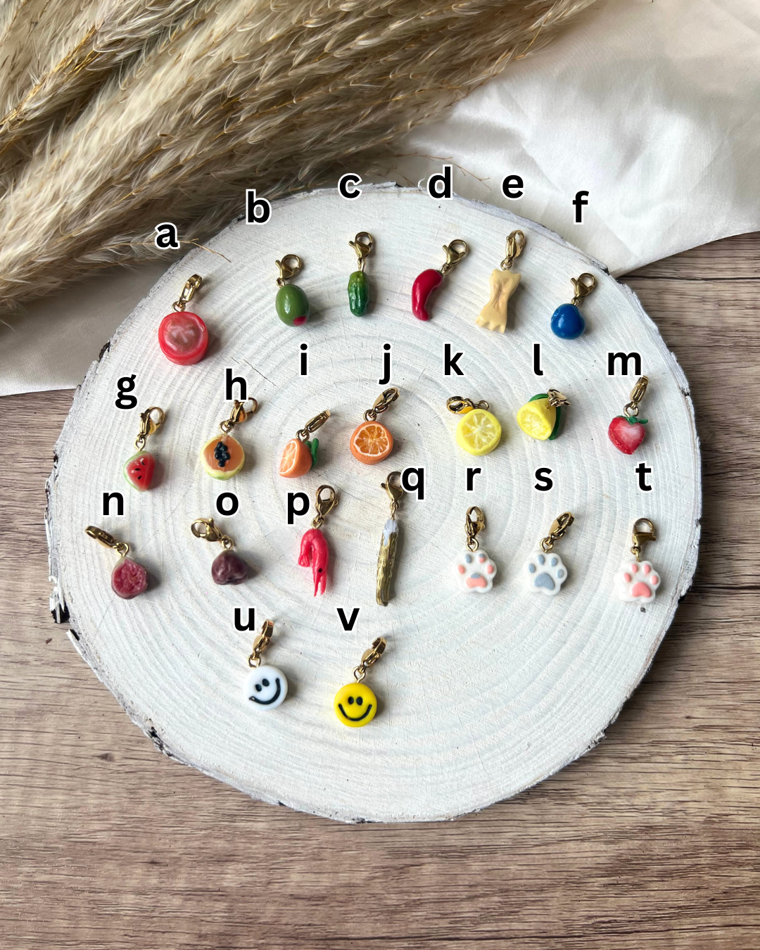 Small fruity charms with eyelet hook and lobster clasp for easy adding and removal to necklace chains or bracelets.
