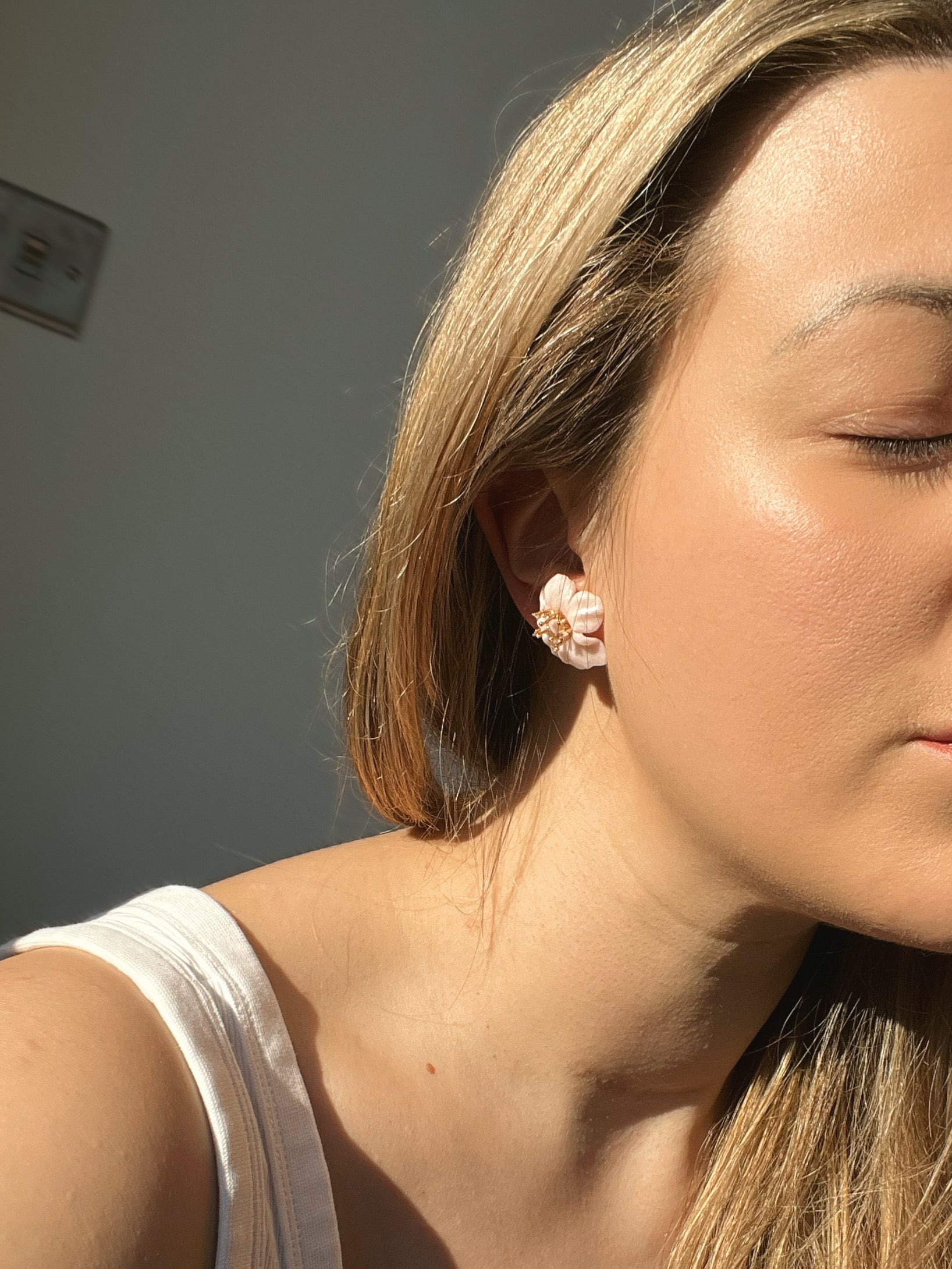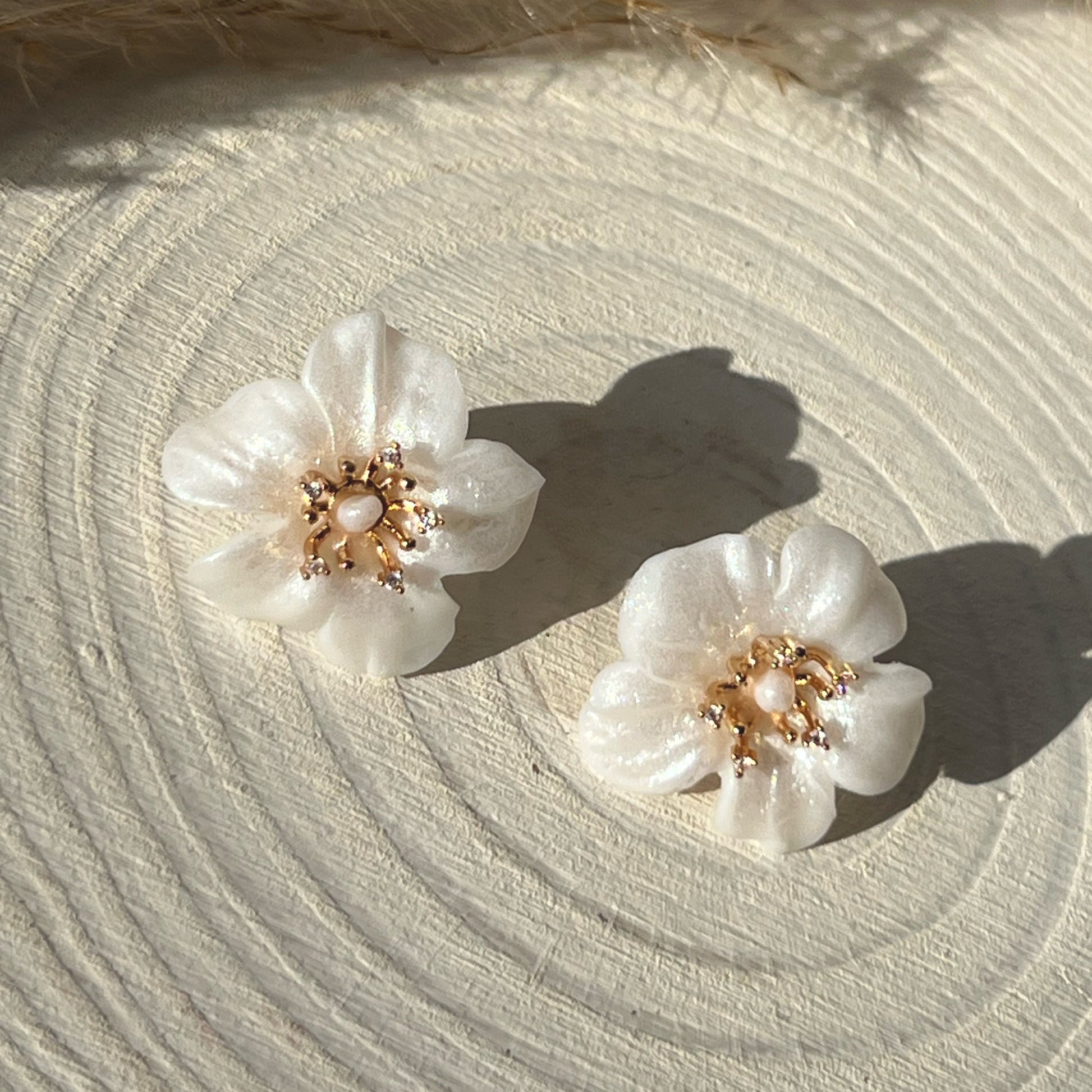 Crafted from high-quality white polymer clay, this beautiful flower boasts a pearl finish and measures 3cm in size. With a surgical steel post embedded in resin for added security, this piece is both stylish and durable.